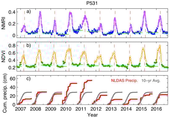 Time series for GPS site P531: (a) NMRI time series after application of a five-day centered median filter; (b) Normalized Difference Vegetation Index (NDVI) data including linear interpolation between observed values. (a,b) data analysis: Green horizontal lines show the baseline level for amplitude calculation, determined separately between peaks. The lavender (yellow) circles for NMRI (NDVI) show the interval above the 25% cut-off around the main seasonal peak. The red vertical dashed line is the Mean Peak day of year. (c) North American Land Data Assimilation System (NLDAS) cumulative precipitation for each Water Year (red), and the 10-year average (gray). P531 is a grasslands site with an annual precipitation of 428 mm at latitude/longitude of N 35.8° and W 120.54°.