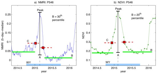 Example analysis used to retrieve the amplitude of the seasonal peak, the Start of Season (SOS) and End of Season (EOS) day of year. The seasonal peak is within the Water Year (thick light blue line on x-axis labeled WY). The baseline (green line B) on each side of the peak is the level of pre/post-growth vegetation. The amplitude (black line A) is the difference between the peak and the average baseline pre/post-growth. The red dotted lines are the 25% cut off levels with respect to the pre/post-growth baselines, and they intersect the main seasonal growth cycle at the SOS and EOS day of year (red squares). (a) the daily five-day median NMRI uses the 30th percentile to define the baseline; and, (b) the interpolated bi-weekly NDVI uses the 20th percentile.