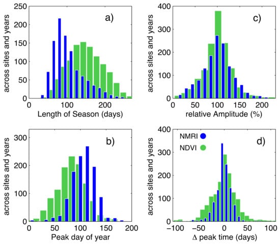 We now compare the magnitude of variability in NMRI and NDVI, across all years and sites. Using the ten years of data for each site, we calculate a mean peak DOY on a site-by-site basis. Then, the deviation of the peak DOY for each growing season is calculated as compared to the mean value. Similarly, we calculate a mean amplitude for each site. The amplitude for each year is then represented as a percent of the mean amplitude at that site. Both NDVI and NMRI exhibit a near-normal distribution of variations in deviation of peak DOY. The standard deviation of peak DOY (Figure 4d) is larger for NDVI (24 days) than NMRI (17 days). Thus, the timing of peak growth based on NDVI varies more from year-to-year. In contrast, the magnitudes of year-to-year variations in amplitude of peak growth are slightly greater based on NMRI (Figure 4c): the standard deviation of NMRI is 33% as compared to 30% from NDVI. Variations in amplitude from both NDVI and NMRI are skewed towards lower values, although more so for NDVI. To summarize, the variations in timing of peak growth based on greenness are greater than based on vegetation water content, but the variations in amplitude of the growth based on water content are slightly greater or are similar in magnitude.