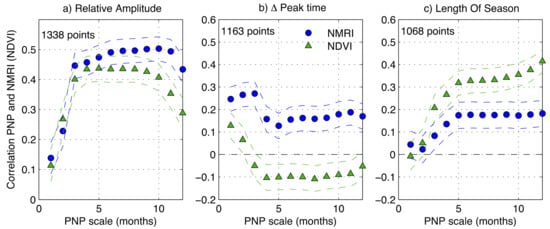 Correlation between the Percent of Normal Precipitation (PNP) computed for the month prior to the NMRI mean seasonal peak day of year (DOY) and NMRI metrics as a function of the PNP scale in months (blue circles). (a) Relative Amplitude; (b) Deviation from the Mean Peak DOY; and, (c) Length of Season. The dashed lines are the 95% confidence interval. The green triangles are the correlation results using NDVI, with PNP computed for the month prior to the NDVI mean seasonal peak.