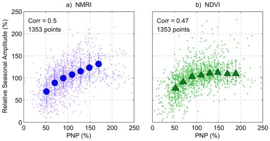 NMRI (a) and NDVI (b) relative amplitude (small dots) versus the corresponding 6-month Percent of Normal Precipitation (PNP). The large symbols are the averaged values over 40% wide PNP bins incremented every 20%. Each bin has a number of points >50.