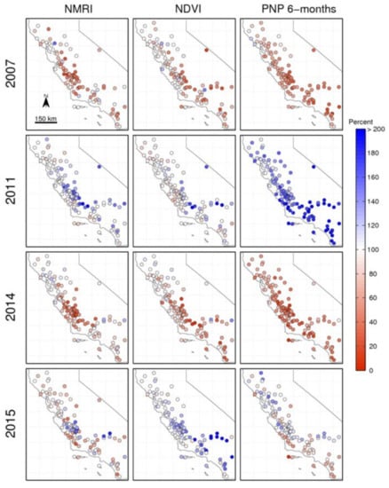 The correspondence between the spatial patterns of precipitation and vegetation anomalies is less in the wet and normal years. This is consistent with the results presented in Figure 6: there is a weaker correlation between amplitude of growth and PNP when the precipitation is at or above average. The year 2011 was the wettest in the 10-year period examined, while 2015 was much closer to normal (Figure 7 and Figure 8). In 2011, nearly all of the sites show PNP exceeding 100%, with a south-to-north gradient from very high to nearly normal precipitation. In contrast, peak growth that is based on NDVI was close to normal everywhere, with the exception of several sites in southern California. This is expected given the complete data set (all years) that is presented in Figure 6b–NDVI anomalies and PNP are not correlated when PNP exceeds 100%. NMRI peak growth was above average at ~20 sites in central California, but close to normal otherwise. 2015 was the first year that the precipitation was near normal after three years of drought (Figure 8). Many sites in central and southern California exhibit above normal peak growth based on NDVI, even though PNP was not above average. The correlation between PNP and NMRI peak growth is higher, including the red-to-blue pattern from the coast inland observed in central California.