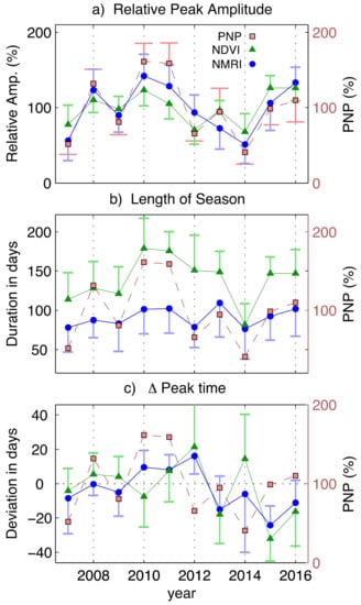 The year-to-year changes in season length based on NMRI and NDVI are highly correlated, and both NMRI and NDVI season length variations are positively correlated with PNP (Figure 8b). The NDVI-based season length from 2014 is a clear outlier. The season length is almost 50 days less than observed in other years. No similar decrease was observed using NMRI. In addition, the timing of the seasonal peak was later than normal, the second highest being in the 10-year interval. We consider possible explanations for this anomalous behavior below. The year-to-year changes in timing of peak growth are similar between NMRI and NDVI. However, the correlation between either NMRI- or NDVI-based peak timing and PNP is limited or non-existent (Figure 8c).