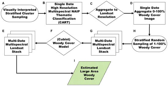 Flowchart summarizing the processing steps and training of a continuous fractional woody cover model using a CART-based thematic high resolution woody cover classification. Cubist extrapolates the estimated woody over large areas using multi-temporal Landsat data.