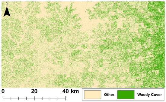 Two datasets containing estimates of continuous woody cover at a 30 m spatial resolution are publicly available. The Global Land Cover Facility has produced a global Landsat Vegetation Continuous Fields (VCF) tree cover layer for 2000, 2005, and 2010. To calculate tree cover, a piecewise linear function using Moderate Resolution Imaging Spectroradiometer (MODIS) surface reflectance and temperature data was created. The model was then fit to every Landsat tile using the Cubist regression tree algorithm [35]. The model achieved an overall root mean square error of 17.4% for North and Central America when compared to Light Detection and Ranging (LiDAR) measurements across four sampled biomes.