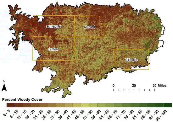 Woody cover encroachment/expansion/conversion is altering grassland and savannah systems around the world [1,2,3,4,5,6,7,8]. The alteration is a complex phenomenon that influences both human and natural systems and their corresponding services. The increase or decrease in the amount of trees and shrubs enhances the livelihood of some fauna, while endangering other species. Woody plants affect both the hydrological and carbon cycles [9,10]. Changes in the percentage of woody cover on the landscape affect water usage and carbon storage. Therefore, it is important that land managers have access to accurate quantifications of woody cover on the landscape.