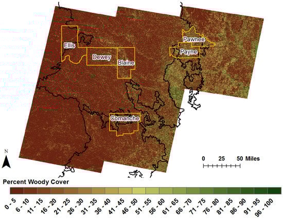 The EPA reports, that in the future, Texas and Oklahoma will most likely see increases in average temperatures and decreases in average precipitation [44,45]. Dry, hot conditions do not directly translate to decreases in woody cover encroachment [1]. However, if the likelihood of drought does increase, it could lead to greater chances for wildfires. Managers can use year-to-year percent woody cover maps to identify areas that need plant removal or controlled burns to avoid catastrophic uncontrolled fires.