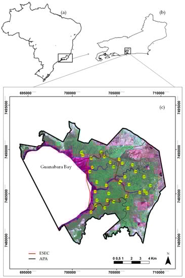 Study area located in (a) Brazil; (b) Rio de Janeiro State (the black box indicates the location of the Guanabara Bay); (c) the Northeast region of the Guanabara Bay showing the Guapimirim Environmental Protection Area (APA Guapimirim) and the Guanabara Ecological Station (ESEC Guanabara) with the locations of the 34 ground plots in yellow (WorldView2 image (band 5 in red, band 6 in green, and band 3 in blue) of 01 October 2012 -EPSG Projection: 32723).