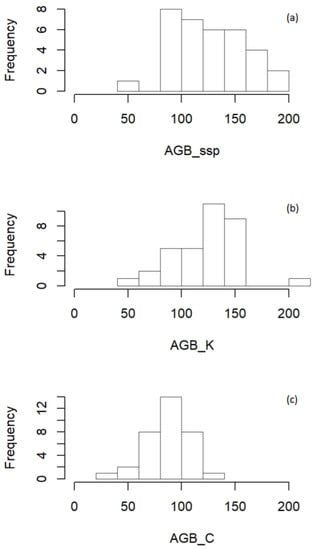 Histogram of aboveground biomass (ABG, t·ha−1) for: (a) species-specific equations (AGB_ssp) and the pantropical equation of Komiyama et al. []; (b) (AGB_K) and Chave et al. []; (c) (AGB_C) of 34 field plots scattered across the mangrove area inside the APA Guapimirim and ESEC Guanabara.