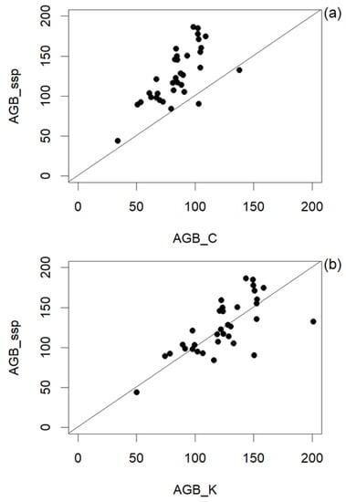 Correlation plot for field-estimated AGB with species-specific equations (AGB_ssp) versus the pantropical equations of Chave et al. [] (AGB_C) (a), and Komiyama et al. [] (AGB_K) (b).