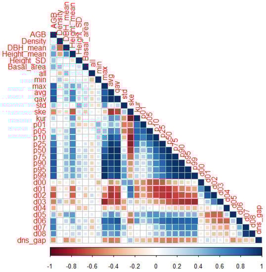 Correlation between structural parameters and the lidar metrics for 34 field plots scattered over the mangrove area inside the APA Guapimirim and ESEC Guanabara. The AGB used is computed using species-specific allometric equations.