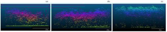 Lidar Cloud point data for (a) Plot 25 (field AGB_ssp: 45.56 t·ha−1); (b) Plot 09 (field AGB_ssp: 126.37 t·ha−1); and (c) Plot 20 (field AGB_ssp: 186.10 t·ha−1).