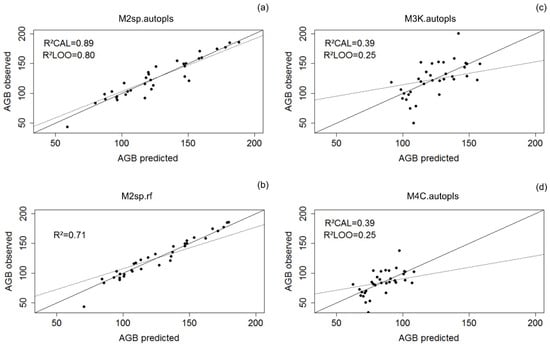 Scatter plots of predicted versus observed AGB (t·ha−1) for (a) M2sp.autopls model (Auto-PLS); (b) M2sp.rf model (RF); (c) M3K.autopls and; (d) M4C.autopls. R2 for RF are comparable to R2(CAL) for Auto-PLS. R2(CAL) is the coefficient of determination in calibration.
