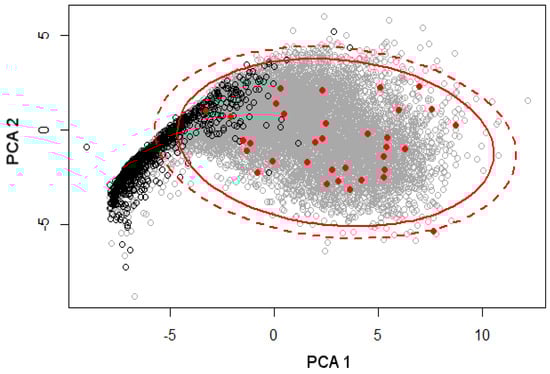 Field plot distribution (in red) on a space plane of principal component 1 (PC1) versus principal component 2 (PC2). The grey circles represent the mangrove forest area and the black circles represent the non-mangrove area. The internal ellipse (solid line) corresponds to 95% confidence and the dashed ellipse to 98% confidence.