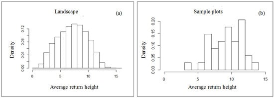 (a) Probability density of average return height for mangrove area on a landscape level and (b) Probability density of average return height for 34 sample plots; height in meters.