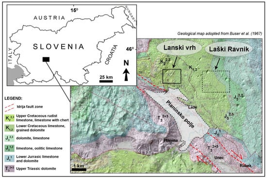 The study area (Lanski vrh) is located in the south-eastern part of the Planinsko polje, within the classical karst of western Slovenia (Figure 1) and is tectonically a part of the Adriatic carbonate platform. Planinsko polje extends along the Idrija strike-slip fault zone in the NW-SE direction. The wider surroundings of Planinsko polje are built of Upper Triassic dolomite as well as Jurassic and Lower and Upper Cretaceous carbonate rocks []. The study area of Lanski vrh consists mainly of Lower Cretaceous bituminous limestones with fossils (Requienia, Miliolidae) interbedded with grained dolomites and Upper Cretaceous rudist limestones and limestones with chert. The wider area is densely covered with solution dolines [], with some collapse dolines (cave roof collapses appearing on the surface) visible as larger depressions on the LiDAR high resolution shaded relief image (Figure 1). Apart from all the mentioned features, there are many explored caves and also remnants of unroofed caves, which often appear at the (Cretaceous) limestone-dolomite contacts.
