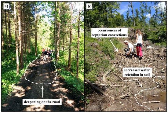 Cave sediments in the study area (Lanski vrh) are mostly distinguishable by slightly yellowish or reddish colour compared to the brownish colour of the soil on carbonate rocks, the so-called “rendzina” (Figure 2a,b). In some places, we can find preserved flowstones (Figure 2c,d) that could be indicators for speleogenesis and septarian concretions, the latter being one of the most reliable indicators for speleogenesis. However, such indicators are generally not preserved in the area. Cave sediments can sometimes also be revealed by deepenings on forest roads, requiring the road surface to be frequently filled to keep it passable (Figure 3a). In these areas, water retention is evident, lasting even through dry periods in summer, so it is often necessary to dig gutters to drain the redundant water (Figure 3b).