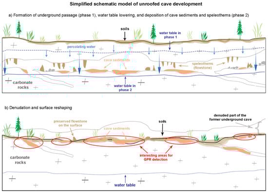 The shape of the unroofed cave depends on the size, shape and type of the former underground cave, as well as on the incline of the surface which cut through the cave. A theoretical model of unroofed cave development is shown on the case of a simple horizontal cave passage (Figure 4). The underground passage developed in the first phase during karstification processes. In the second stage, the water table starts dropping, which results in the passage gradually becoming completely dry. During this stage, cave sediments are being deposited in the passage and speleothem growth begins. At some point, denudation reaches the passage and the cave starts to disintegrate, becoming a part of the surface topography. Therefore, cave sediments appear on the surface or are located right below the surface. In some places, the surface flowstone is well preserved but it mostly occurs locally in smaller pieces. Strong surface reshaping masks the primary form of the cave, which is why detecting cave sediments with GPR can help us follow and connect certain surface features into unroofed cave systems. The areas on which we focused in this study are presented in a simplified model (see the red ellipses in Figure 4).