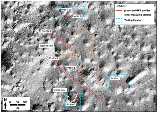 Larger attenuated areas restricted to 22 m in length in the areas of Profiles 1, 2a and 2b, as visible on the radargrams, suggest that these areas are related to cave sediments, where pieces of flowstone also indicate their presence. Geomorphologically, these areas are relatively flat with an elevated surrounding relief. They could represent the very last surface manifestation of the segments of the unroofed cave system and cave channels, like the ones visible in the nearby area of Laški Ravnik (see Figure 3 in []). An additional sign for identifying unroofed caves are the geomorphological features of the surrounding terrain. Depending on the cave type and the manner in which denudation cut the cave, unroofed caves can appear as elongated dolines, series of dolines, shafts or linear to irregular depressions completely filled with sediments [,,]. Apart from that, surface processes can strongly reshape and modify the segments of the former cave, so they are sometimes completely masked, meaning that their speleogenetic origin cannot be demonstrated.