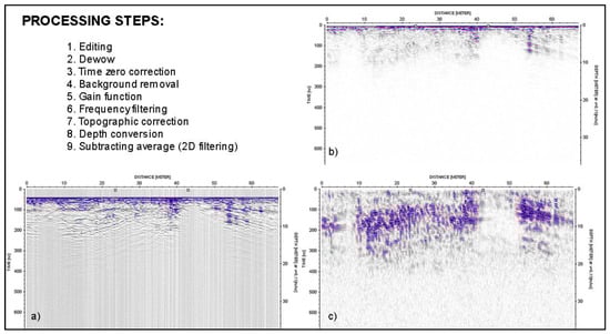 Processing steps (1–9) applied in profiles. Raw data and some processing steps are presented for Profile 1: (a) Raw data; (b) After dewow and time zero correction; (c) After background removal, manually-defined exponential gain correction, frequency and 2D filtering.