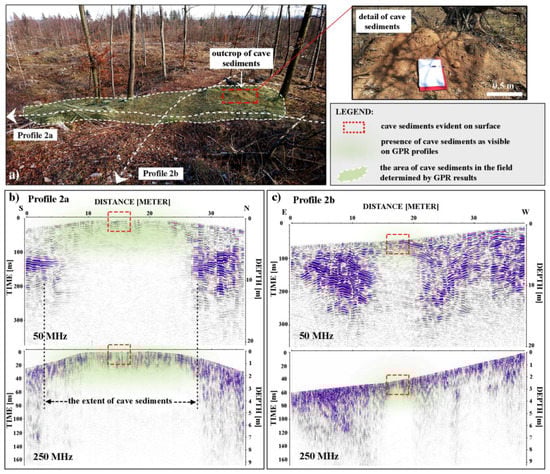 (a) Direction of perpendicular Profiles 2a and 2b recorded with a 50 and 250 MHz antenna (vertical exaggeration of the 250 MHz GPR images is 1:2) in the area of the cave sediments outcrop to determine their spatial extent; (b) Extent of cave sediments was determined in Profile 2a; (c) Boundaries of cave sediments detected by GPR are limited to the area of the outcrop visible on the surface.