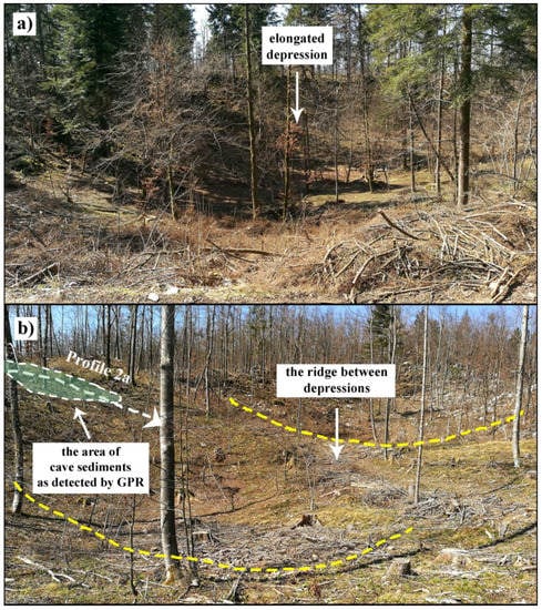 Surface topography in the vicinity of detected cave sediments: (a) An elongated depression at the location of Profile 1; (b) The surface morphology in the area of Profiles 2a and 2b, where depressions pass from one to another with intervening small ridges.