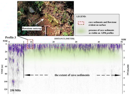 Radargram acquired with a 250 MHz antenna, where the spatial extent of cave sediments was revealed along Profile 3.