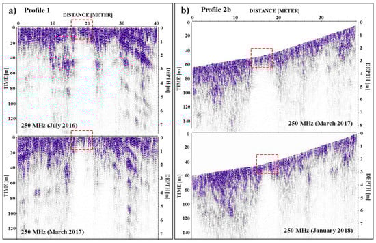 The GPR images obtained in various field conditions using the 250 MHz antenna and the area of cave sediments (dashed red lines): (a) Profile 1 acquired in July 2016 (very dry field conditions) and in March 2017 (dry field conditions); (b) Profile 2b acquired in March 2017 (dry field conditions) and in January 2018 (moderately wet field conditions).