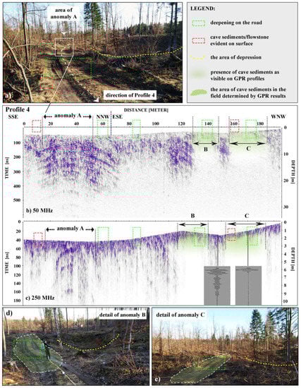 In Profile 4, three anomalous areas are clearly seen on the radargram (Figure 12b,c). First, the concave downward anomaly in area A is seen at the beginning of the profile (distance 15–70 m in the 50 MHz image and 22–65 m in the 250 MHz image). The location of the anomaly detected by GPR corresponds with the position of the two successive elongated depressions (Figure 12a). Considering the GPR results and the geomorphological characteristics of the closer area, we concluded that this area was a depression that was filled and compacted with material during the construction of the road. Furthermore, the filled depression below the road and the two elongated depressions most probably belong to the segments of an unroofed cave, especially due to the fact that flowstone occurs in two places along the depressions on the line from the road to the entrance of Najdena cave. The concave downward reflection in the profile is completely contrary to our expectations for a filled circular depression. The study completed by Goodman and Piro [], in which they modelled a deeply buried circular trench, revealed that the shapes recorded on raw radargrams may have a completely opposite structure in the ground and can be mistakenly interpreted as a reflection pattern due to a buried cylindrical object.