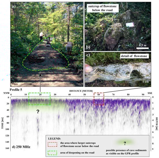 (a) Roadwork, where slightly deepened areas need to be filled with coarse-grained material to keep the road in function; (b) Large outcrops of flowstone occur below the road; (c) A detail of flowstone structure; (d) In the radargram of Profile 5, the area of the possible presence of cave sediments is not as obvious as in other profiles.