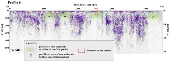 Cave sediments were also clearly evident in other GPR profiles, where cave sediments or flowstone occur only occasionally in the vicinity of the GPR lines. All detected anomalies visible as highly attenuated areas in the presented profiles are related to the larger sedimentary regolith bodies. In the areas where superficial indicators complement their speleogenetic origin, these thicker sediment occurrences can be defined as cave sediments (Figure 12 and Figure 13).