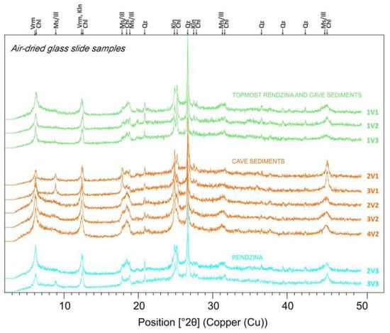 The quantitative XRD analysis shows a rather similar mineralogical composition of cave sediments and soils on carbonate rocks (rendzina), where vermiculite (Vrm), chlorite group minerals (Chl), muscovite/illite (Ms/Ill), kaolinite (Kln) and quartz (Qz) were detected in all samples (Figure 15). Hematite (1–2%) is present in some samples of cave sediments and rutile was detected in one surface sample from V1. Na-plagioclase feldspar (7–10%) are present only in soils on carbonate rocks.