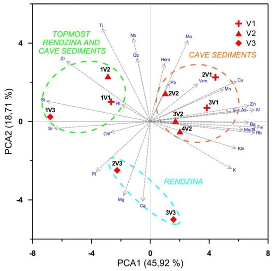 Principal component analysis (Figure 16) explained 64.63% of the variance in the data by the first two components (PCA1 and PCA2). It is a procedure for finding hypothetical components that account for as much of the variance in multidimensional data as possible []. Samples from location V3 are associated with the high values of Si, Sr, Mg and Ca related to the well-crystallized carbonates, Na-plagioclase feldspar, quartz and chlorite group minerals. These samples also contain lesser amounts of clay minerals (kaolinite, illite and vermiculite). A high proportion of Al, Fe, Mn, Ti, S, Rb, Ba, As, Zn, Zr, Nb, Cu, Pb and Mo belongs to samples of cave sediments (V1 and V2). Most of them are related with clays (Kln, Vrm), as well as Fe/Al/Ti oxides/hydroxides. Fe/Al/Ti oxides/hydroxides were not detected by XRD due to broad reflections and poor crystallinity of such minerals.
