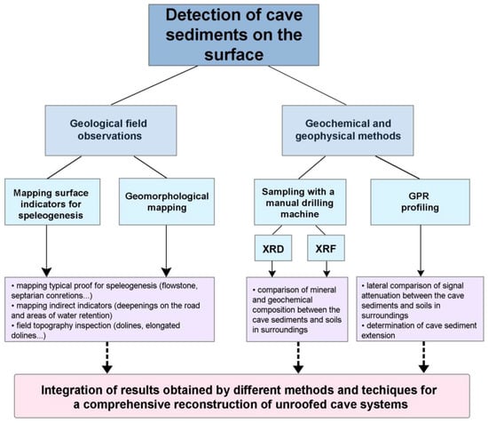 The synthesis of results from different methods used in this study is shown in Figure 17. For a comprehensive determination, many techniques and methods should be used to minimize the ambiguities in interpretation. Field work, which includes geomorphological mapping and locating all surface indicators of speleogenesis on a LiDAR map, is very important. Based on terrain observations, GPR profiling can be properly planed and locations for the mineralogical and geochemical analyses can be selected. For a proper reconstruction of unroofed cave systems, each location of cave sediments must be specifically investigated due to heterogeneous mineral composition of the cave sediments. The lateral comparison of signal attenuation between the cave sediments and soils in surrounding proved to be very good indicator for the cave sediments presence. However, signal attenuation can occur also in areas of filled shafts or other regolith bodies. Due to the very complex and heterogeneous characteristics of karst underground system, which is full of voids, different features of various sizes and shapes, automatic recognition of cave sediments cannot be provided. Besides that, cave sediments can have very heterogeneous mineral composition and their extent can be of various size and shape. In order to provide possible automation of the proposed procedure (e.g., []), additional mineralogical-geochemical analyses should be done in the future and the electrical resistivity tomography (ERT) as a complementary method can be conducted in the further research. However, due to the locally rough karst terrain and the time-consuming nature of ERT, we decided to apply only the GPR method for the purpose of this study.