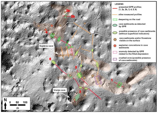 The relatively complex terrain of the study area, full of dolines, complicates the task of recognizing the various features as a cohesive whole model, compared to unroofed cave systems observed in Classical Karst, where segments of unroofed cave systems are easier to identify (e.g., [,,,]). To study the location, size and shape of unroofed caves, high-resolution LiDAR data proved to be very useful []. Where LiDAR data are not available, aerial photos can also be an indispensable tool in planning the proper location of GPR profiles []. Nowadays, remotely gathered data (e.g., LiDAR) in conjunction with the ground penetrating radar method and field observations enable easier and comprehensive studying of various geomorphological issues [,,,,,,,,]. Previously unrecognized geomorphological features can now be revealed by LiDAR data in combination with different geophysical methods. It is important to note that all GPR results should be correlated and integrated with field topography observations. The extent of cave sediments derived from GPR profiling was further placed on the LiDAR image to facilitate the final interpretation (Figure 18). In addition, the terrain was meticulously re-examined after GPR measurements to determine any possible connections of the detected anomalies with the surrounding topography (Figure 9 and Figure 12a,d,e).