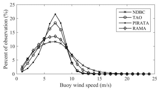 Wind observation data during the same period of ISS-RapidScat wind vectors obtained by 83 moored buoys from NDBC, 62 moored buoys from TAO/TRITON, 14 moored buoys from PIRATA, and 12 moored buoys from RAMA are used in this study. Buoy winds are looked as the true wind. Only buoys more than 50 km away from lands and islands are selected and buoy winds are regarded to be consistent in the area of ISS-RapidSCAT wind vector cells. The locations of these buoys are shown in Figure 1. The buoy winds are measured hourly by averaging the wind speed and direction over 10 min. Four sets of buoy winds are measured by different instruments with different accuracies at different heights from the ocean surface. The estimated accuracies of buoy wind speed and direction are 0.3 m/s and 2° [15]. The percentage of the number of observations by four sets of buoys is shown in Figure 2, and it can be seen that most buoy wind speeds are smaller than 12 m/s. In order to make the buoy data comparable with ISS-RapidScat, all of the buoy winds were converted to 10-m neutral winds using the LKB model [16,17,18]. For the quality control of buoy data, monthly time series are constructed and used to perform a basic quality check on the buoy data. This quality check procedure only keeps values within an acceptable physical range, and removes outliers by looking at the deviation from the mean of each monthly data record and from the deviation from one hourly value to the next [19].