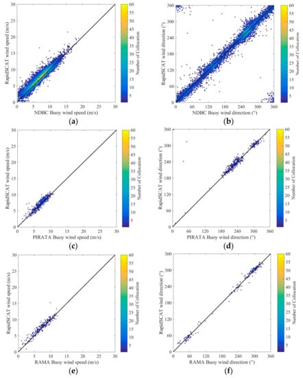 The overall historical archived ISS-RapidScat Level 2B 12.5 km ocean surface wind vectors during the period from 3 October 2014 to 19 August 2016 are compared with global moored buoys’ wind data. Data pairs totaling 12,578 from 83 NDBC buoys, 1092 from 14 PIRATA buoys, 899 from 12 RAMA buoys, and 5603 from 62 TAO buoys are collocated by the method introduced in Section 2. The scatter diagrams of comparisons of wind speed and direction are shown in Figure 4. In general, buoys’ wind speeds were overestimated slightly by RapidScat for all wind speed ranges. Their wind directions are consistent for all different directions.