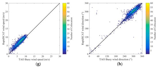 Scatterplots for wind speed and direction of the comparisons between RapidScat and moored buoys. (a) NDBC wind speed; (b) NDBC wind direction; (c) PIRATA wind speed; (d) PIRATA wind direction; (e) RAMA wind speed; (f) RAMA wind direction; (g) TAO wind speed; (h) TAO wind direction.