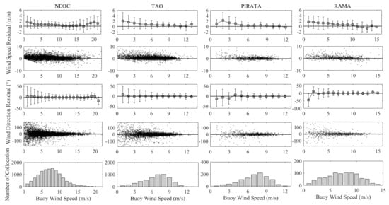 In order to analyze the errors of RapidScat wind vectors at different wind speeds, the biases and RMSEs between RapidScat and buoy wind data are calculated in bins of buoy wind speeds of 1 m/s, and the wind speed and direction residuals (RapidScat-buoy) are also analyzed in bins of buoy wind speeds of 1 m/s. The results are shown in Figure 5. The error bars indicate the bias and the RMSE.