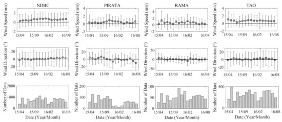 It is shown in Figure 5 that the wind speed residuals for four sets of buoys decrease with the increasing buoys wind speed and the biases of RapidScat wind speed are basically larger than 0. This also means that RapidScat overestimates the wind. The RMSEs of RapidScat wind speed decreases firstly when buoy wind speeds are less than 12–13 m/s, and then increases with the increasing buoy wind speed. The biases of the RapidScat wind direction are also close to 0 and there is the obvious trend that the RMSEs of the RapidScat wind direction decreases with the increasing buoy wind speed. The errors of the RapidScat wind vectors at different months from April 2015 to August 2016 are also analyzed, which are shown in Figure 6. The comparisons of RMSEs of the RapidScat wind speed and direction at different months show that there is no dependence on the time regarding the accuracy of the RapidScat wind vectors and the accuracies are consistent during the entire period. The biases of the RapidScat wind speed at different months shows that there is an annual periodic signal regarding the RapidSCAT wind speed errors, as shown in Figure 6, especially for NDBC and PIRATA buoys. The operating mechanism of a scatterometer makes the errors of the retrieved winds have no dependence on the time. The possible reasons for these results are the annual cycle variation of ocean winds causing the annual error variations of buoy wind observations. This means that the accuracy of in situ observations of ocean surface wind vectors depends on the magnitude of the wind speed. There is no same signal regarding the biases of the RapidScat wind direction because the accuracies of the wind direction depend mainly on the magnitude of the wind speed.