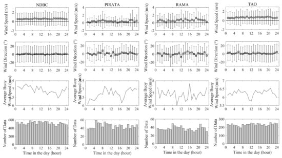 RapidScat can observe the same place at different times of the day, so the accuracies of RapidScat wind vectors at different times in one day are also analyzed, as shown in Figure 7, by counting the errors at the same time of different days. The comparisons of RapidScat ocean surface wind speed and direction errors at different times in a day for all buoys show that there is no obvious difference regarding the errors at different times of the day even if the average buoy wind speed at different times varied largely (shown in the third line of Figure 7), especially for the comparisons with the NDBC and TAO buoys. The analyses of less collocated data of the PIRATA and RAMA buoys show a slight fluctuation with no periodic and trend variability in the errors of wind speed and direction. Therefore, the accuracy of the RapidScat wind vectors at different times of the day is basically consistent and with no diurnal variation.
