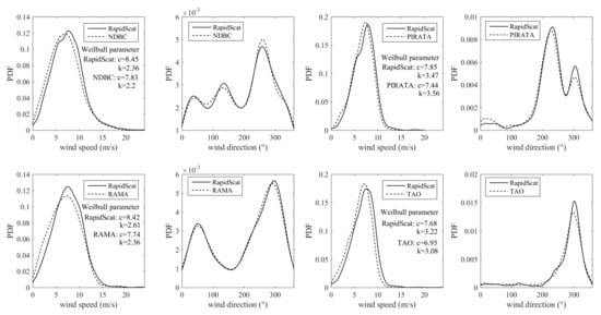 To understand the abundance of the collocated data for an entire possible range of ocean surface wind, probability distribution functions (PDFs) of the collocated data are plotted for wind speed and direction as shown in Figure 8, and the Weibull parameters of wind speed [23] in the distributions of the collocated data are also given in Figure 8. The distribution behavior of PDFs of RapidScat and buoys for wind speed and direction imply the similar characteristics of RapidScat wind vectors and buoy observations. The wind speed histograms of RapidScat and buoys at speeds less than 15 m/s have a slight offset, which indicates that the RapidScat wind speed is slightly larger than the buoy wind speed; that is, RapidScat overestimates the buoy wind. This has been proven in the above analysis. The Weibull shape parameters of four sets of buoys and RapidScat wind speeds are similar and this shows the consistency of the collocated data. The differences of the Weibull scale parameters show that RapidScat overestimates buoy wind speeds.