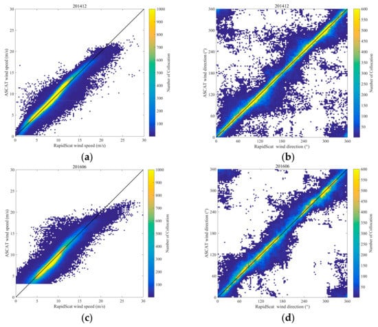 Scatterplots for wind speed and direction of the comparisons between RapidScat and ASCAT in December 2014 and June 2016. (a) wind speed in December 2014; (b) wind direction in December 2014; (c) wind speed in June 2016; (d) wind direction in June 2016.