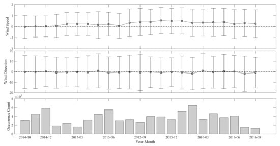 The differences (RapidScat-ASCAT) are analyzed through the statistical parameters, including bias, RMSE, and R, introduced in Section 2 at the different months from October 2014 to August 2016, respectively. The scatterplots of comparisons in typical months, including December 2014 of the minimal wind speed RMSE, and June 2016 of the maximal wind speed RMSE, are shown in Figure 9. The ASCAT wind data less than 3 m/s during June 2016 are absent in the original data. RapidScat wind vectors feature the wind speed being larger than that of ASCAT when it is more than 15 m/s, and the possible reason is that their working microwave frequencies are different and their response to the high wind speeds are different. Scatterplots of wind direction show that there is a clear oscillation of wind direction differences and the existence of wind direction 180° ambiguities. The possible reason is that there may be systematic biases for some wind directions and not for others. The differences in different months are given in Table 3. The bias and RMSE of wind speed are between −0.02 and 0.55 m/s and 0.95 and 1.31 m/s, and those of wind direction are −1.85°–0.87° and 13.62°–17.31°. These indicate the consistency of RapidScat and ASCAT wind vectors, and they have the same accuracies of wind vectors.