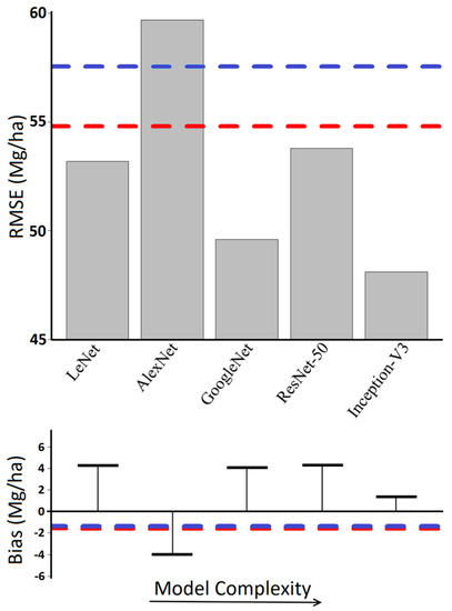 The best performing CNN architecture was Inception-V3, which was also the most complex CNN, with the greatest number of layers and over 20 million trainable parameters. Inception-V3 had a RMSE of 48.1 Mg/ha, representing an 11% decrease in error from 54.1 Mh/ha with the RF-THM model, and a 16.5% decrease from the 57.6 Mg/ha RMSE in the LMM-THM model. The absolute bias of Inception-V3 was lower than the RF-THM and equal to the absolute bias of the LMM-THM model, at 1.3 Mg/ha. This was 68% lower than the next best performing CNN architecture, GoogleNet with 4 Mg/ha bias. The architectures using inception layers (GoogleNet, and Incepton-V3) were the top two performing architectures in terms of lowest RMSE and bias.