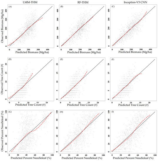 Predicted vs. observed plots for each of the three model types estimating biomass, tree count, and percent needleleaf. The solid line is a one-to-one line, and the dashed red line is a loess regression fit of the data. Left (A, D, and G): linear mixed models with traditional height metrics (LMM-THM). Center (B, E, and H): random forest models with traditional height metrics (RF-THM). Right (C, F, and I): Inception-V3 convolutional neural networks (Inception-V3 CNN).