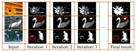 It was found that the performance of the sparse representation can be significantly controlled by its dictionary quality and, therefore, can directly determine the saliency detection results (Figure 3) in the proposed RSR method. Since the dictionary is extracted with the initial saliency map, namely, the eye-fixation result only, the detection accuracy is highly dependent on the fixation results. Aiming to weaken the shortcomings of the above dependency, a simple recursive process was constructed around the initial saliency map to optimize the results. The effectiveness of the optimization is apparent in the visualization results of Figure 4. The pseudocode of the recursive processing is described as Algorithm 1.