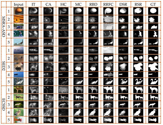 In this section, the performance of the proposed RSR method is evaluated by comparing it to the following seven state-of-the-art saliency detection algorithms: IT [5], the contrast-aware saliency detection (CA) [8], HC [33], MC [36], RBD [29], recursive regional feature clustering model (RRFC) [19], and DSR [31]. The evaluation measures were analyzed in the benchmark [18], which contained the curve, the curve, and the mean absolute error (), and were used for quantitative comparisons. All the measures are detailed in Section 3.2. The up-arrow after a measure indicates that the larger the value achieved, the better the performance; while the down-arrow indicates the smaller, the better. It is noted that, for a binary mask, was used to represent the number of non-zero entries in the mask.