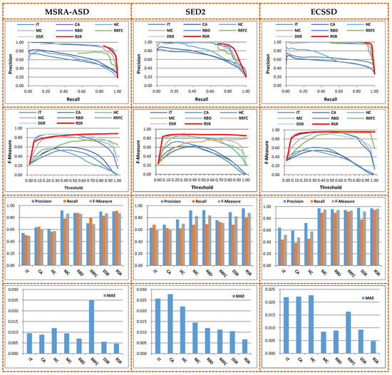 The quantitative comparison between the proposed RSR method and the seven state-of-the-art methods was completed with curve, and measure. Figure 7 shows the evaluations on the MSRA-ASD, SED2 and ECSSD datasets.