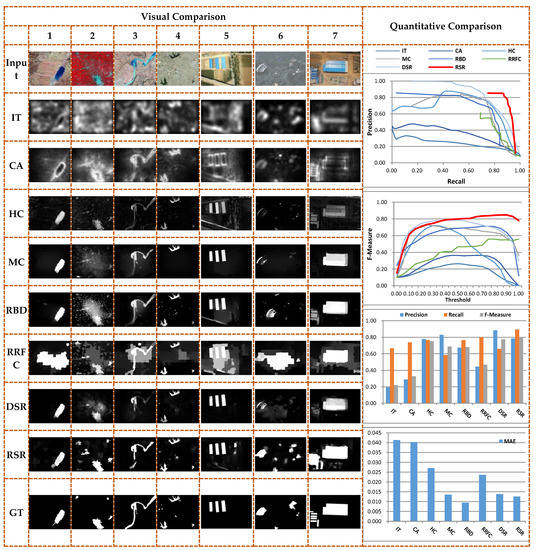 As for remote-sensing images, it is easy to find that all the experimental methods faced an ability reduction. Although the ground truth generated by hand lacks validation and might weaken the reliability of the evaluation, it can also help in the completion of the comparison analysis. In terms of Figure 8, there is an over-detection shortcoming of the proposed RSR, whereby some small areas in the complex environment background were given a high salient level and detected.